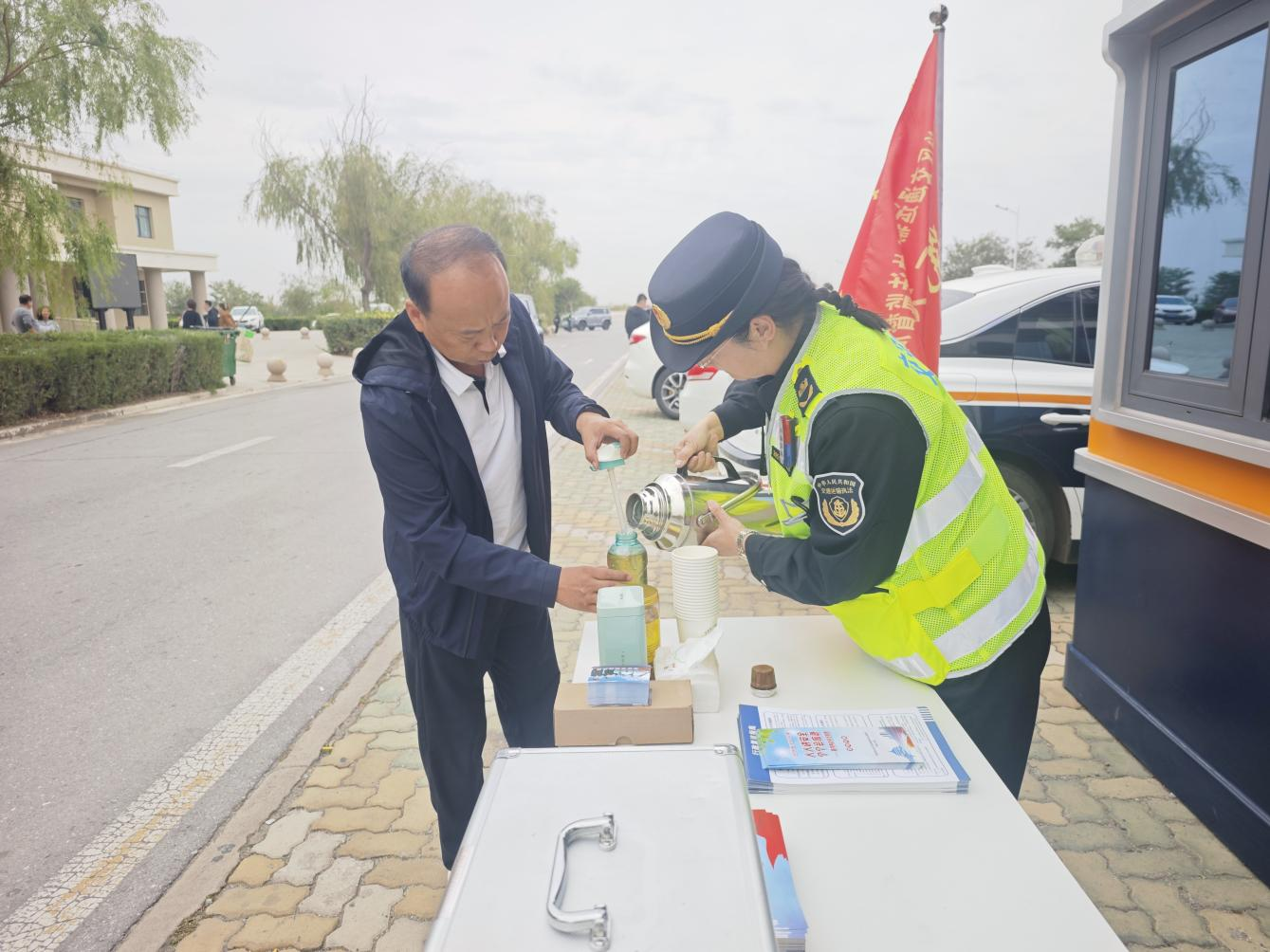 分局在京藏高速惠农服务区执法服务保障点设立党员先锋岗,精选党员模范与执法骨干驻点值守。执法人员既当“秩序员”,通过引导车辆分区有序停放、精准管控大件及危货车辆,让服务区通行效率显著提升;又做“服务员”,依托交通运输执法服务亭,主动提供开水补给、手机充电、简易修车工具、应急药箱等便民物资,同步开展道路指引与出行安全宣讲。截至目前,已累计服务群众30余人次,帮扶受困群众2人次,鲜红的先锋岗旗帜下,“贴心守护”成为司乘人员的共同感受。