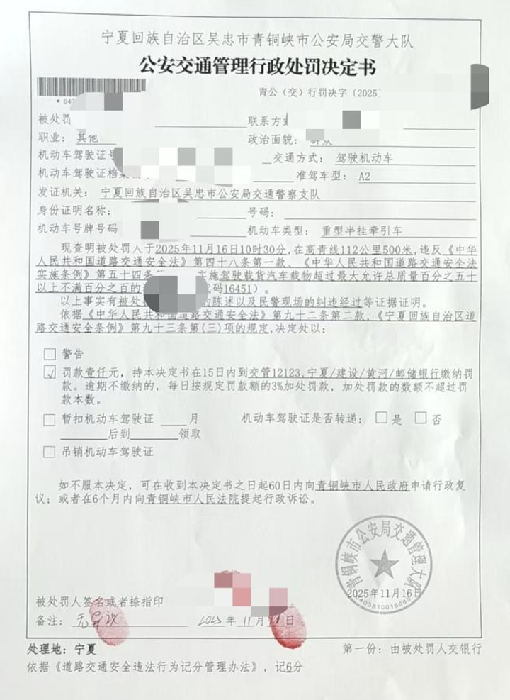 检测数据与询问笔录均确认,驾驶员驾驶的六轴货车超载率已达70.2%,其行为违反了《宁夏回族自治区治理货运车辆超限超载办法》第二十九条第三款之规定。“您的车辆超载率已超过50%,依据规定,将处以1000元罚款,记6分。”在执法五大队业务大厅,到站协助办理的交警清晰地向陈师傅说明了处罚依据和标准,并当场出具了《行政处罚决定书》。陈师傅驾驶员核对所有信息无误后,签字、按手印确认。