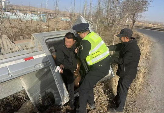12月10日10时32分,宁夏交通运输厅执法监督局中卫分局执法四大队执法人员按照日常行政检查计划在S205线开展公路行政检查工作,行驶至S205线K165+900米处时,远远望见一辆客货车侧翻在路边,执法人员立即靠边停车。