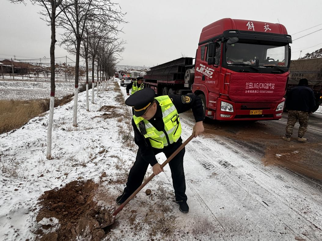 撒沙融冰,夯实通行安全基础。巡查至G109线时,执法人员发现前方几辆大货车因路面结冰轮胎打滑,车身左右晃动,导致后方逐渐拥堵。执法人员当机立断,迅速取出工具,手持铁铲将沙土撒布在结冰路面,每一个动作都力求扎实,有效化解车轮打滑风险。