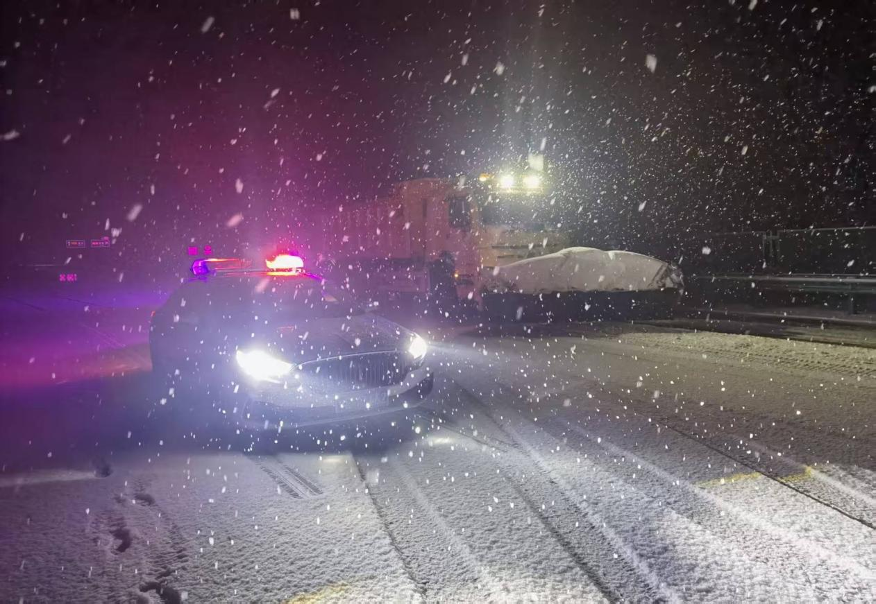大队执法人员坚决落实分局“精准谋划抢先机、靶向排查除隐患”专项行动要求,持续加强对易结冰、急弯陡坡等重点路段的动态巡查与实时监测。夜晚风雪未歇,巡查不止,执法人员通过执法终端精准上报实时路况信息。在除雪现场,执法人员迅速布设安全警示标志,利用车载警示灯与喊话器在寒夜中不间断提醒过往车辆减速慢行、保持车距,并全程协助、警戒养护部门的机械除雪与融雪剂撒布作业,有效保障了夜间作业的安全与效率,以实际行动在跨年之夜筑牢路面安全“防护网”。